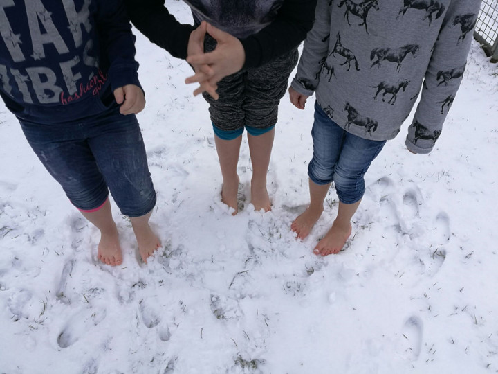 Endlich Schnee! Wer traut sich mit bloßen Füßen den Schnee zu spüren?