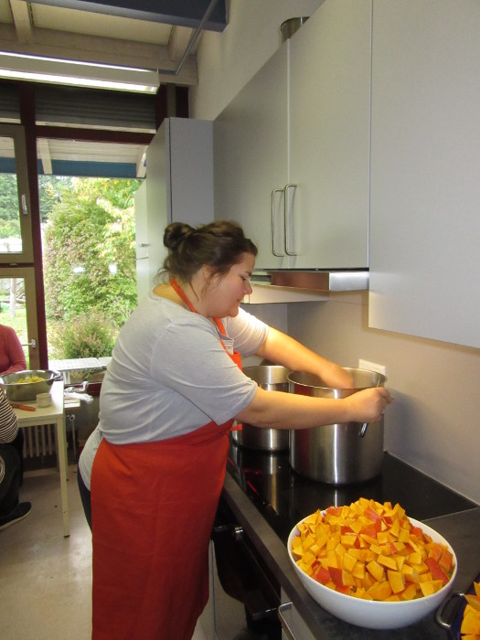 Frau Bauer kocht für das Schulfest die Kürbissuppe. Den ganzen Vormittag lang arbeitete Sie mit ihrem "Team" in der Küche. Das Ergebnis war eine hervorragende Suppe die erheblich zur guten Stimmung an diesem Tag beigetragen hat. Vielen Dank!